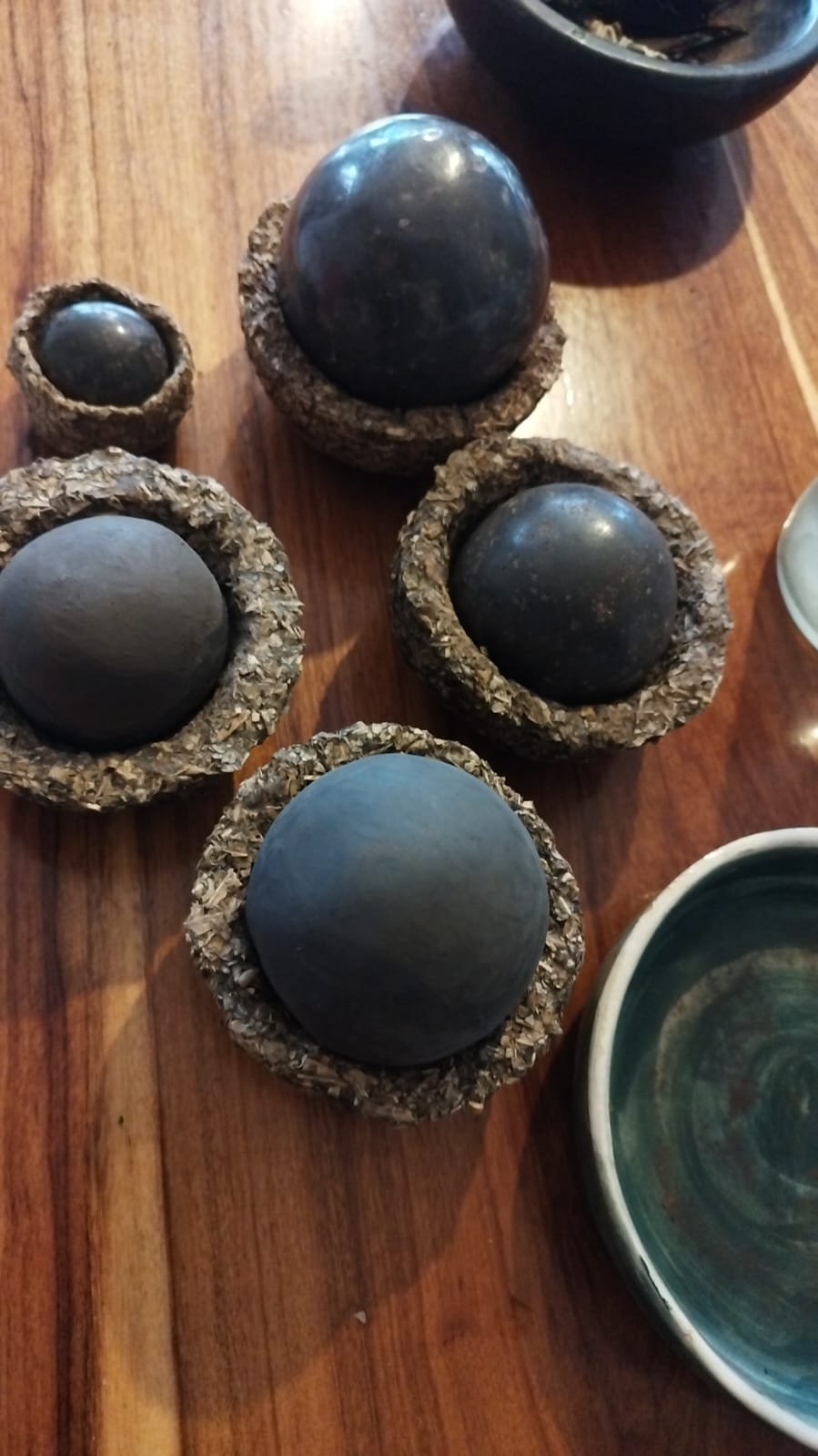 Este dorodango es una esfera artesanal de barro, cuidadosamente pulida hasta lograr un brillo suave y profundo, inspirada en una tradicional técnica japonesa de meditación. Presentado en un cuenco biodegradable elaborado con yerba seca y engrudo, el conjunto forma un objeto único, armónico y sustentable.